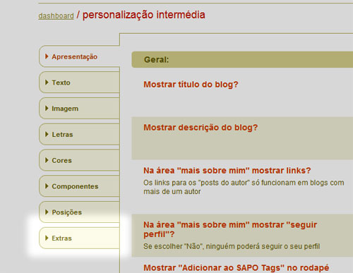Avisem-nos se encontrarem qualquer dificuldade ao fazerem uso destas funcionalidades. De notar ainda que, blogs que tenham sido personalizados com a nossa ajuda, ou em S2, não apresentam este novo separador. Contactem-nos por e-mail caso não encontrem o novo separador Extras na Personalização Intermédia.