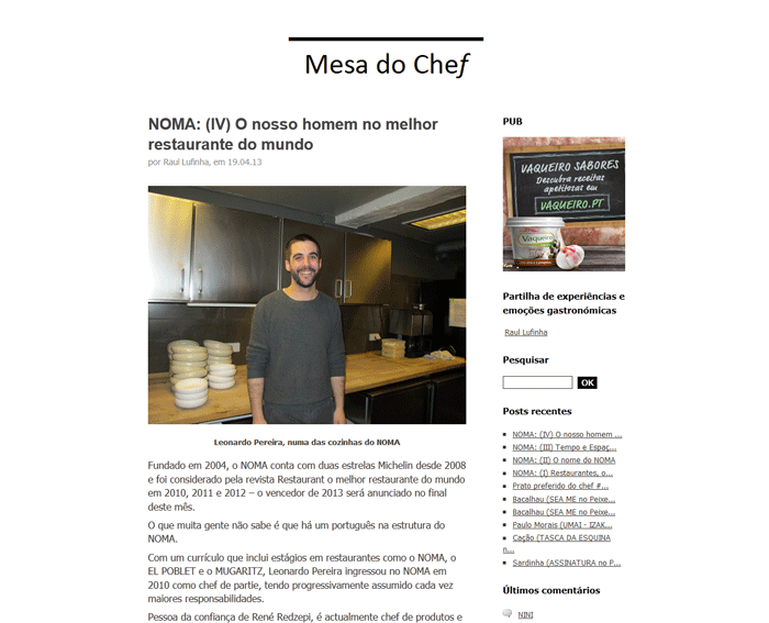 Esta semana, podem encontrar no Mesa do Chef o relato de uma visita ao NOMA, considerado pela revista Restaurant o melhor restaurante do mundo há três anos consecutivos, e onde trabalha um chef português, Leonardo Pereira.