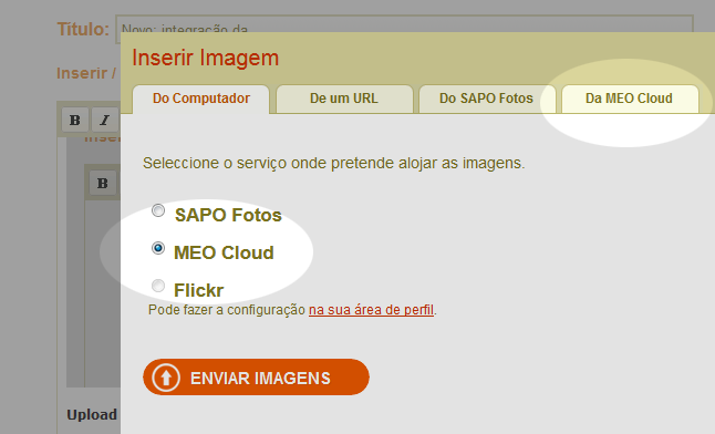 Além do SAPO Fotos e Flickr, passam a poder escolher a MEO Cloud para alojar as imagens usadas nos posts. O upload de várias imagens através da MEO Cloud é muito rápido e tem esta vantagem adicional: é possível usar a aplicação desktop da MEO Cloud para gerir facilmente as imagens partilhadas no blog.