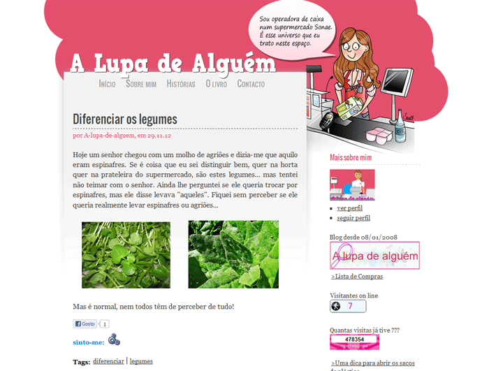 Se há coisa de que gostamos é ser surpreendidos ao abrir a página de um blog do bairro e descobrir que foi redesenhado. Hoje foi a vez do A lupa de alguém, que contou com a ajuda da Sara Teixeira (cujo blog destacámos aqui há alguns dias) para a excelente ilustração no cabeçalho.