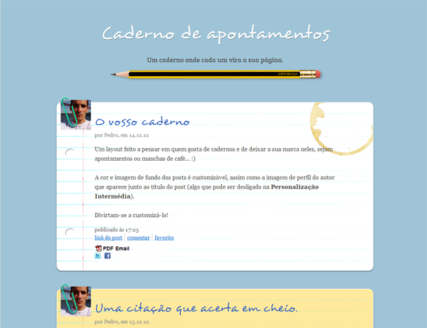 O Caderno de Apontamentos, para quem gosta de cadernos. Das cores às imagens de fundo dos posts, é tudo customizável :)