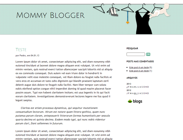 O Mommy Blogger, da autoria da Claudia Vieira e dedicado a todas as mães que gostam de blogar. Além das habituais definições que podem customizar (letras, dimensões, etc), a imagem de cabeçalho é transparente pelo que pode funcionar com a vossa cor preferida.