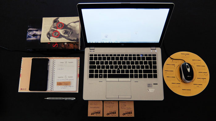 Há duas coisas que talvez saltem à vista nesta fotografia que reflete o meu ambiente de trabalho grande parte das vezes que escrevo no blog: a organização excessivamente alinhada das coisas (juro que é tal e qual assim e, sim, sei que tem um travo de OCD) e os post-its. Se acham que viram tudo o que os post-its têm para dar...é porque não viram o ambiente de trabalho do computador em si – onde nem me dou ao trabalho de escolhar uma foto/imagem para wallpaper, porque está todo pejadinho de notas coloridas umas em cima das outras (obrigada à aplicação Sticky Notes).
