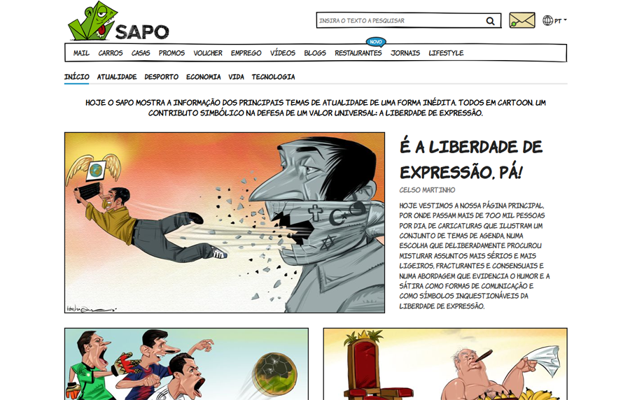 Esta semana destacamos o Henrique Monteiro, cartoonista do SAPO e autor do HenriCartoon desde 2008. Na semana passada, numa iniciativa dedicada à liberdade de expressão, transformou todas as notícias na homepage do SAPO em cartoons. Rompemos com o nosso formato de cinco perguntas para questionarmos o Henrique sobre essa experiência e a sua perspetiva como cartoonista dos atentados em Paris no dia 7.